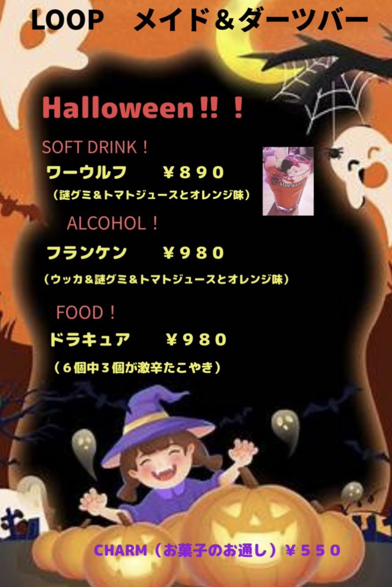 土曜日の営業時間は18:00〜24:00♬ 👩‍🎓きりちゃん17:00〜21:00 🐣ひよこちゃん17:30〜21:30 ☃️こゆきちゃん19:00〜23:00 🎯なのJAPANレディース19:45〜23:45 🎯ねねperfect女子20:00〜24:00 👽るーぷちゃん18:00〜24:00 🎃ハロウィン👻イベント😈お通し¥550 かわいいメイドさんが仮装してお出迎え♪ https://t.co/IturkZjOmp