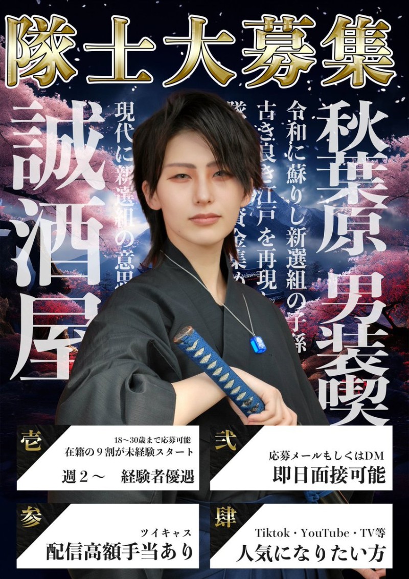 🔹男装募集🔹 誠酒屋の"新人隊士"を募集します🏯🌕 経験がある方、移籍も歓迎します🇯🇵 【在籍の9割が🔰未経験スタートのお店】 即日、面接OK👌ご応募、詳細はこちらから 👉 https://t.co/xbwZHPL2xP #秋葉原 #男装カフェ #誠酒屋 #男装バイト #コンカフェ求人 #TikTok https://t.co/kNxdf6r3md