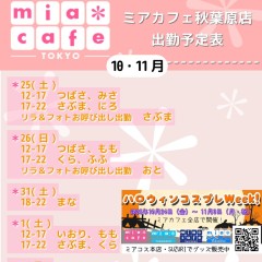 ★#メイドカフェ ・ミアカフェ #秋葉原 店★ ☕️営業予定日☕️ 👻#ハロウィン フリーコス EV👻 🎃10月25日(土)  12-17 つばさ,みさ  17-22 さぶま,にろ  リラ&フォトお呼び出し出勤 さぶま 🎃10月26日(日)  12-17 つばさ,もも  17-22 くら,ふふ  リラ&フォトお呼び出し出勤 おと #コスプレ https://t.co/Iw8jqpvp1W