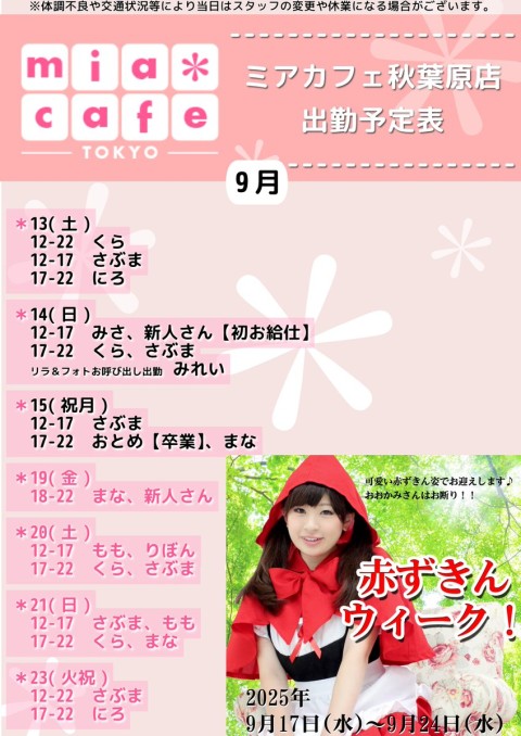 ★メイドカフェ・ミアカフェ秋葉原店★ ☕️営業予定日☕️ 🐺❤️赤ずきんウィーク🐺❤️ 🐺9月19日(金)  18-22 まな 🐺9月20日(土)  12-17 もも  12-17 りぼん  17-22 くら  17-22 さぶま 🐺9月21日(日)  12-17 さぶま  12-17 もも  17-22 くら  17-22 まな 🐺9月23日(火祝)  12-22 さぶ https://t.co/4e0aeWMAEv