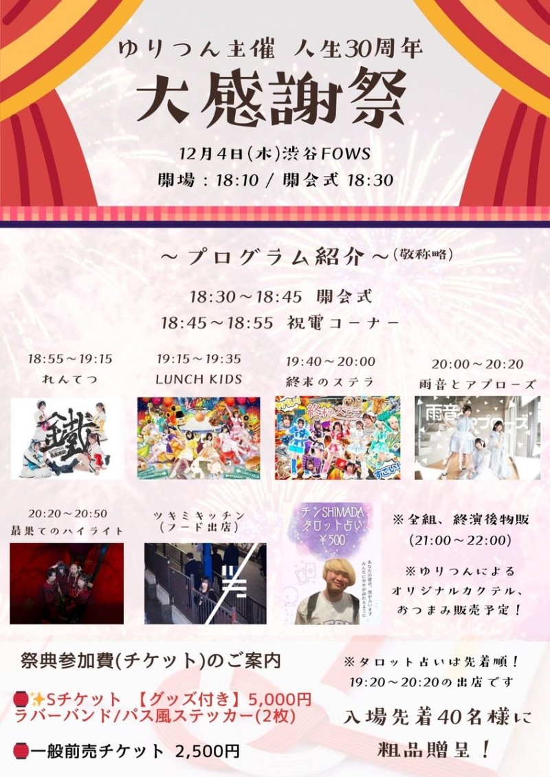 @wgnm_mashiro @a_s_a_m_a_ @hayab1115 12/4朚ゆり぀ん䞻催 人生30呚幎倧感謝祭 📍枋谷FOWS ⏰OPEN18:10START18:30 🎀18:55-19:15 📞21:00-22:00 🎫SSï¿¥15,0004枚限定Sï¿¥5,00010枚限定Aï¿¥2,500圓日¥3,000※各1D 🔗https://t.co/WwYLkS2C0l https://t.co/bL1nLRxTvs