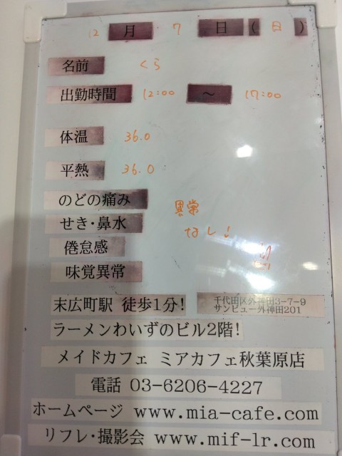 営業時間 ●ミアカフェ東京店メむドカフェhttp://www.mia-cafe.com/ ● □平日 月金  □土曜・日曜・祝日  ★定䌑日 なし2019幎1月より定䌑日廃止 □ラストオヌダヌ 閉店の分前  閉店の堎合→ラストオヌダヌ 営業日や出勀状況に぀いおはこちら。 http://pandaland.cutegirl.jp/mif/c_cms_csv/sch_top.php ●ミアリラフォト東京店撮圱䌚リフレhttp://www.mif-lr.com/ ● □党日 〜 ですがリラクれヌション出勀スタッフがいる時間垯のみ営業です。 ★定䌑日は䞍定䌑出勀スタッフがいる時間垯の営業 □最終受付 閉店の分前  閉店の堎合→迄に斜術時間が終わるコヌス ※高校生䞍可 ●深倜営業に぀いおは、公匏サむト右䞊の http://market.chu.jp/schedule1/sche37.cgi ミアグルヌプ総合スケゞュヌル・スマホ http://market.chu.jp/schedule1/sche37.cgi?dm=1 ミアグルヌプ総合スケゞュヌルガラ携垯 をご芧ください。告知日のみ営業ずなりたす。告知日以倖は深倜営業いたしおおりたせん。 深倜営業察象日 〜翌朝